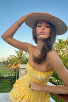 Turn heads with the Anya Ruffle Mini Dress, a stunning combination of elegance and playful charm. Featuring a strapless bandeau top and a gracefully open back, this dress creates a sophisticated yet alluring silhouette. Whether you're dressing up for a special event or a night out, its refined details ensure effortless glamour.