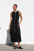Elevate your style with our sleeveless black maxi dress, featuring a striking high round neckline and eye-catching white contrast stitching. This dress effortlessly blends classic elegance with a contemporary edge, making it ideal for both casual outings and special events.