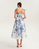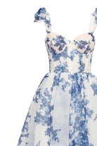Blue-Navy Floral Midi Dress – Embrace romantic elegance with our blue-navy floral midi dress, crafted from airy organza to give you a graceful, ethereal look. With its heart-shaped neckline, bow tie straps, and flared A-line silhouette, this dress is designed to make you feel confident, feminine, and unforgettable.