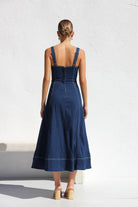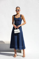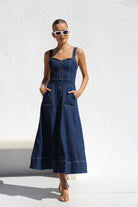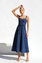 Elevate your look with this indigo blue denim dress, featuring thick adjustable straps and a charming sweetheart neckline. The faux button detailing down the front adds a touch of classic appeal, complemented by practical front pockets.