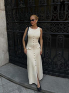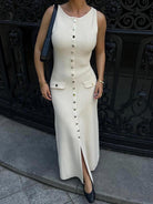 Elevate your wardrobe with the Fiona Knit Sleeveless Maxi Dress, a timeless blend of elegance and modern sophistication. Designed with a classic round neckline and a figure-flattering silhouette, this dress effortlessly enhances your natural shape. The gold button details and faux front pockets add a refined touch, making it perfect for both daytime occasions and evening gatherings.