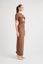 Florence Dress in Chocolate—a reimagined take on the beloved Vicolo top, now transformed into a stunning full-length dress. Crafted from buttery soft fabric with elevated hardware detailing, this dress seamlessly blends elegance and versatility, making it easy to style up or down for any occasion.