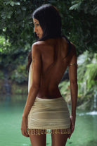The Lalapa Butter Mini Dress is a sensual, sculptural piece that combines handcrafted details with ethereal sensuality. Designed in New York and handcrafted in India, this dress is a sleek, sculptural piece that combines handcrafted details with ethereal sensuality. The adjustable front and back ties allow you to customize the fit, while the open back adds a bold accent.