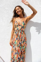 Elevate your style with our vibrant multicolor print midi dress, designed to make a bold statement. It features adjustable straps and a ruched bust for a flattering fit. The invisible back zipper ensures a smooth silhouette, while the removable self-tie belt with side loops offers versatile styling options.
