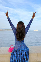 A dreamy fusion of edge and elegance, the Lily Mesh Maxi Dress brings artful flair to occasionwear. Crafted from sheer blue mesh fabric with a striking graffiti-style digital print, this piece features delicate long sleeves, a flattering fitted waist, and a dramatic pleated hem that moves with effortless grace. The wave-shaped seam at the skirt adds sculptural depth, making it a true statement piece.
