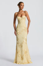 The Nefertiti Maxi Dress in lemon features stretch mesh with floral ribbon appliques, underwired cups, and spaghetti straps. Its open lace-up back and internal corset with boning create a flattering, elegant silhouette, finished with a fit-and-flare skirt.