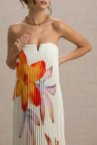 Bergamot is this season's hottest occasion dress, the perfect blend of effortless elegance and sophisticated detailing. Crafted from premium pleated fabric, this maxi dress features a bright orange floral print and a structured sweetheart neckline and playful V-shaped underwire bandeau. The loose silhouette hugs curves gracefully, while the built-in corset provides subtle support for comfort and eye-catcher.