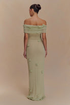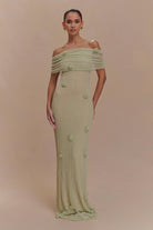 Gracefully romantic and effortlessly refined, the Orchid Whisper Off-Shoulder Fishtail Maxi Dress is designed for moments that call for charm and poise. Crafted in a fresh light green hue, this elegant knit maxi features a soft off-the-shoulder neckline delicately adorned with three-dimensional orchid appliqués—bringing a sculptural, ethereal beauty to your look.