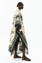This oversized flamingo caftan dress flows gracefully with an elegant silhouette, making it the perfect choice for effortless holiday style. Featuring a playful flamingo and palm tree print on a light beige and black base, this caftan is crafted from a blend of 30% lyocell and 70% recycled polyester, offering a lightweight and beautifully draping texture. The relaxed fit, side slits, and 3/4 sleeves create a breezy, flowing movement, ideal for watching sunrises and sunsets in comfort and style.