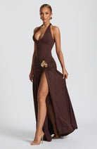 Drape yourself in elegance with the Saira Maxi Skirt in rich plum brown. Crafted from luxurious slinky jersey, this sophisticated design features a dramatic thigh-high split and mid-rise silhouette. The asymmetric ruched panel accentuates the hips, while the full, gathered skirt creates a graceful flow. Complete with a removable statement orchid brooch.