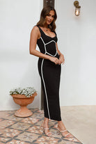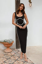 With an invisible back zipper for easy wear, the dress also includes a sleek back slit for added movement. The white contrast detailing creates a striking visual effect, making this piece perfect for special occasions where you want to stand out in style!
