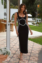 This elegant maxi dress features a bodycon style that beautifully hugs your curves. Thick straps offer support and a modern look, while the slightly low-cut back adds a touch of allure.