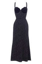 Timelessly chic and effortlessly feminine, the Velvet Dot Elegance Midi Dress blends classic charm with modern sophistication. This black midi dress features delicate spaghetti straps and a subtle polka dot pattern that adds playful elegance to its refined silhouette.
